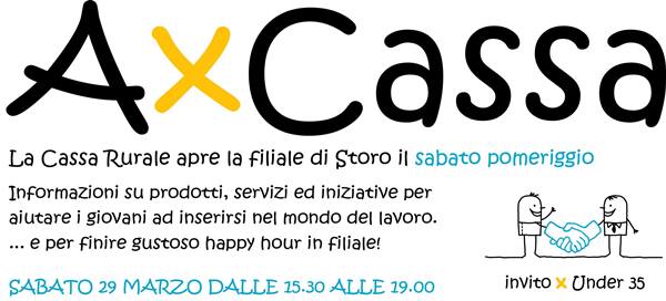 Torna AxCassa, la simpatica ed apprezzata iniziativa che la Cassa Rurale Giudicarie Valsabbia Paganella organizza per i giovani con meno di 35 anni. Sabato 29 marzo dalle 15.30 alle 19.00 la banca di credito cooperativo presieduta da Andrea Armanini apre infatti le porte della filiale di Storo ai giovani della Valle del Chiese.