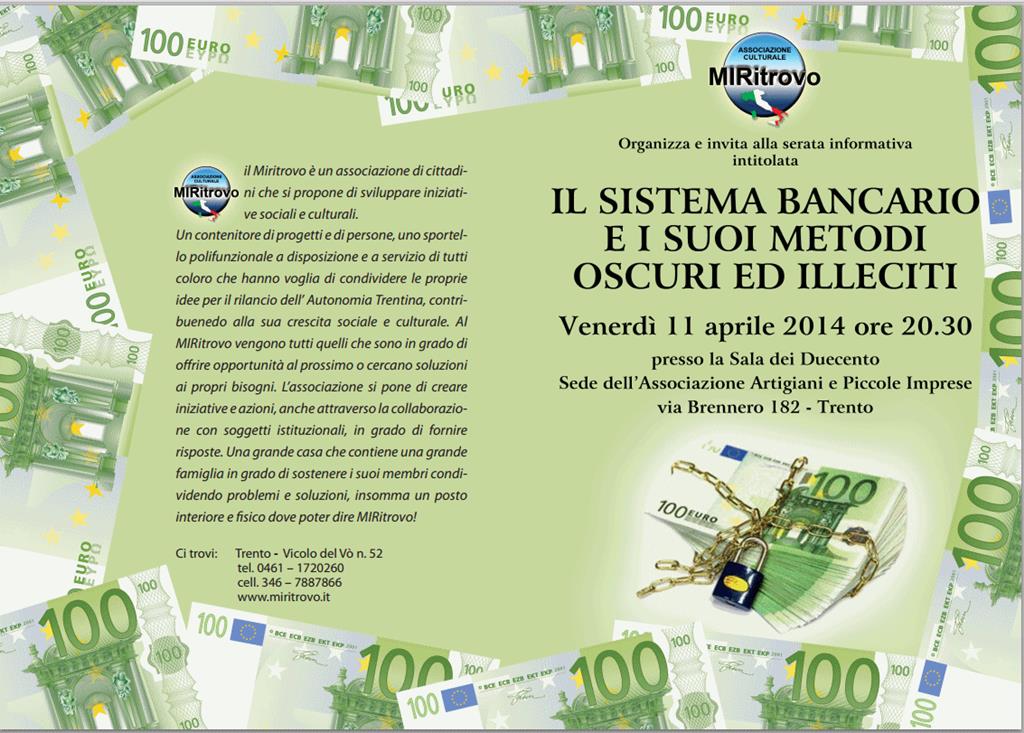 Si svolgerà Venerdi 11 aprile alle ore 20.30 presso la Sala dei Duecento (sede dell'Associazione Artigiani e Piccole Imprese di Trento) la serata promossa dall'Associazione culturale MIRitrovo che vuole informare la cittadinanza sui lati oscuri del sistema bancario, comprendendo se e come questo sia responsabile della crisi economica che attanaglia il nostro Paese e dei molti drammi personali, familiari e sociali di cui quotidianamente si viene a conoscenza.