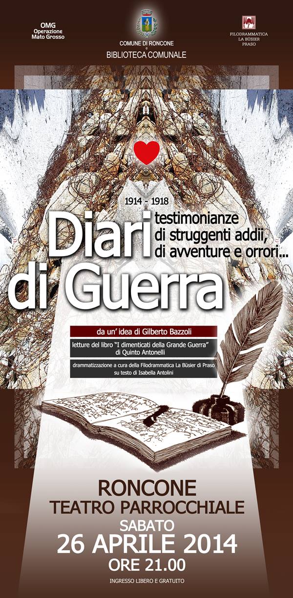 Andrà in scena sabato 26 aprile con inizio alle ore 21 presso il teatro parrocchiale di Roncone la rappresentazione teatrale che rievoca alcuni momenti ed alcuni temi legati alla Grande Guerra: uno spettacolo che venne ideato e programmato da Gilberto Bazzoli, prematuramente scomparso un anno fa il giorno di Pasqua in un tragico incidente sotto una valanga in Piemonte.
